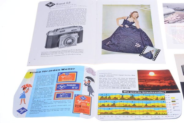 Bottom left contains (IN GERMAN) Silette I, Isoly, Agfalux, Prisma binoculars 8x30, optima, Movex automatic.