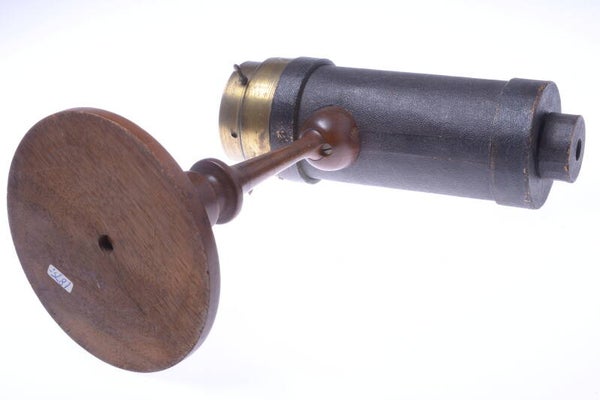 The kaleidoscope is overall in cosmetically and mechanically in good condition. Barrel shows some signs of prior use. Barrel shows few small dings, some tarnishing to the brass lacquer, minor scuff marks. The main barrel middle part is in very good condition. Front moves smoothly and view is pretty bright. All is original and it shows no repairs. Beautiful rare piece.