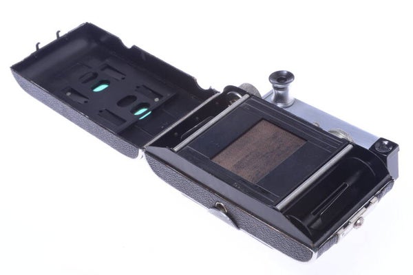 Blinds show pin holes and a small gap in between them. Note, this is a Feet distance scale version and has ‘Germany’ engraved on top of the film wind knob.
