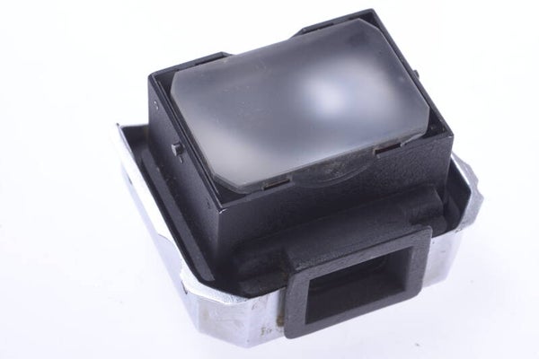 The finder is in fairly good condition. It shows moderate signs of prior use. Shows some deformation at the top. It shows some scuffs, some chrome rub off just at the top, no paint rub off, no dings, no dents and no scratches. Focus ground glass in good and clean condition, shows no scuffs, shows no scratches.
