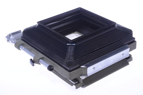 Comes with original ground glass, base, light leak free original tapered bellows, ground glass holder and Sinar Norma rear 5x7” stand.