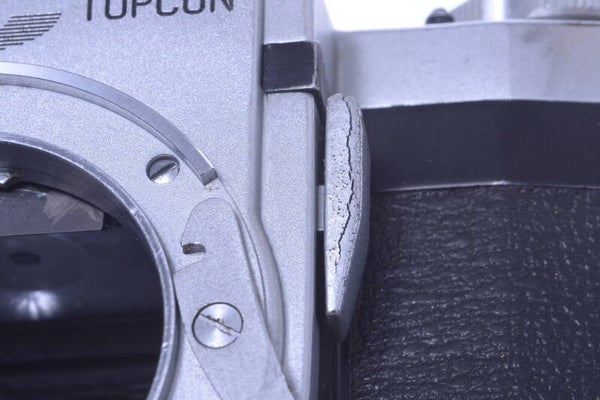 Overall and the rest of the camera shows moderate signs of prior use and is in good condition. Shows some scuffs, few small scratches, slight indentation at the top of the prism, some dings, no dents, shows paint rub off, cover shows some wear. Focus screen, mirror and prism in very good, bright condition, shows some dust.