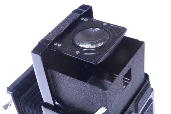 The camera shows some signs of prior use and is overall in very good condition. Shows minor scuffs, few small scratches, no dings, no dents. Shows some paint rub off. No wear at the cover. Magnifier glass and mirror in clean and both in very good condition. Camera comes with shoulder strap.