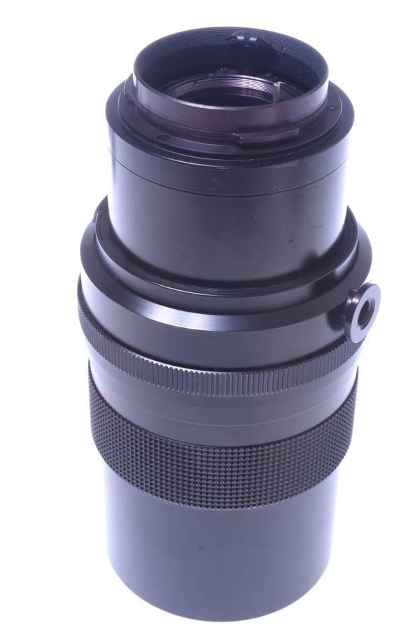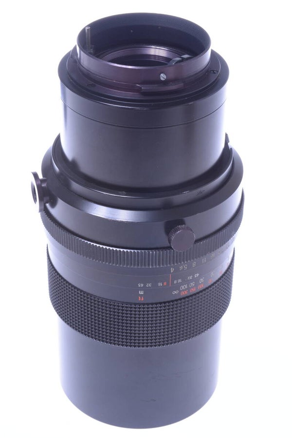 Lens shows minor signs of prior use and is overall in very good condition. Shows some small scuffs the sides, few superficial scratches, no dings, no indentations, minor paint rub off. Aperture setting moves very smooth. The elements are in very good condition. No cleaning marks, no scratches, no haze, no fungus, no separation. Shows really minor dust particles inside. Aperture blades show no wear and are clean, open and close very smooth. Focus turns smooth. Lens comes with original caps, hood and case. And of course the side grip seen in the pictures. Very nice, rare complete lens.