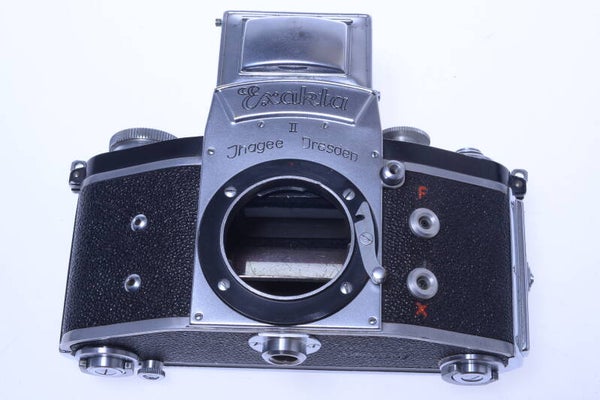 Overall the camera shows some signs of prior use and is in pretty good condition. Shows minor scuffs, few small scratches, slight bent left of the word Exakta, no dings, no dents, some paint rub off, cover shows no wear. Focus screen in very good, bright condition, shows some dust.