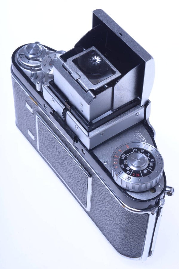 Overall the camera shows minor signs of prior use and is in pretty good condition. Shows minor scuffs, few tiny scratches, no dings, no dents, minor paint rub off, cover shows no wear, small spot of chrome loss at the back. Focus screen in very good, bright condition, shows some dust. Camera is ready for use.