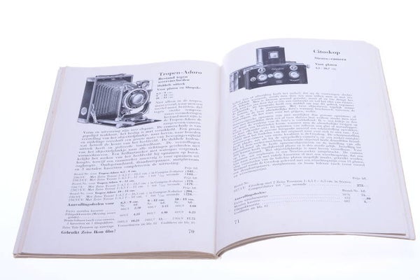 Clean, no tears, some discoloring. Very nice catalogue on cameras mentioned in the details and were available in the Netherlands at that time. Prices in Dutch Guilders.