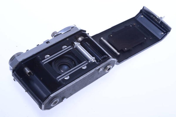 The lens is cosmetically and mechanically in very good condition. Lettering is bright and clean. Lens/shutter unit shows no dings, no dents, no paint rub off, no scuff marks and no scratches. The elements are in very good condition. No cleaning marks, no scratches, no haze, no fungus, no separation. Shows some dust particles inside. Aperture blades show wear and are clean. Aperture open and close perfectly and very smooth. Focus turn smooth. Shutter ring moves smooth. Bellows is in light leak free condition. Camera opens and closes perfectly.