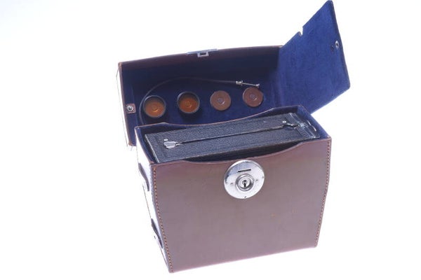 Camera comes with original filters set, caps and case. Filters go inside the top lid of the case. Case shows some wear, no shoulder strap, stitches in very good condition and case is very solid