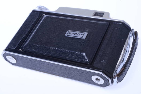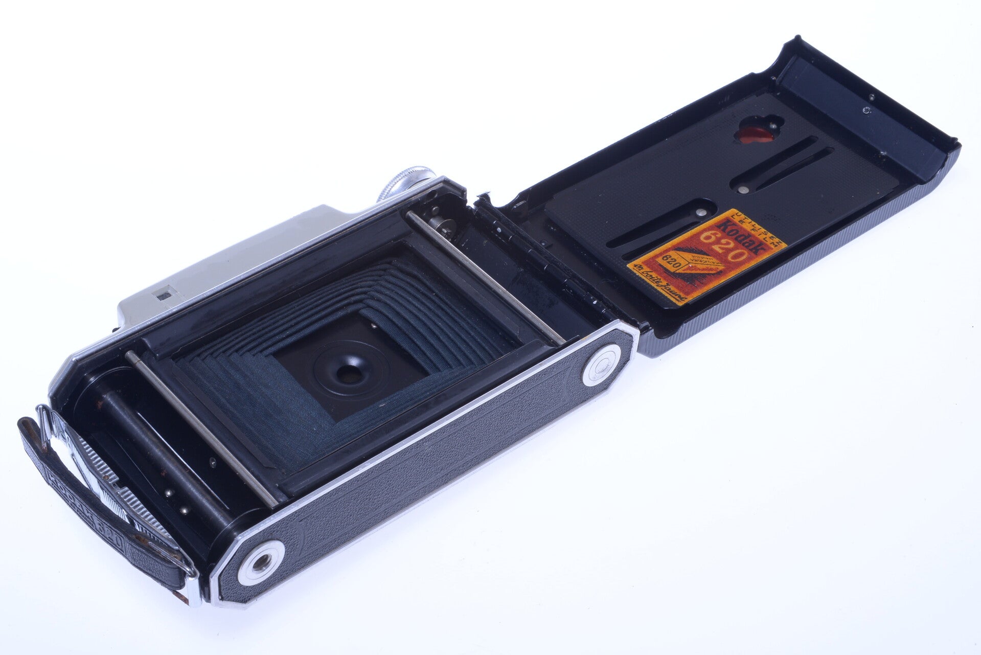 The lens elements are in very good condition. No cleaning marks, no scratches, no haze, no fungus, no separation. Shows minor dust particles inside. Aperture show no wear and is clean. Aperture works. Focus turns smooth. Bellows are light leak free. Camera lens unit folds open perfectly. Film winds on smooth. Comes with 620 take up spool.