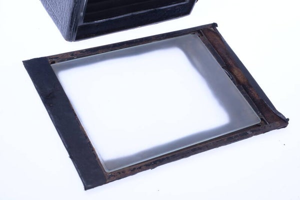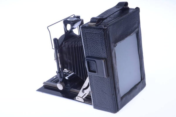 Shutter works perfectly at all faster speeds, longer speeds also accurate! Comes with leather case and 3 glass plate holders and case.