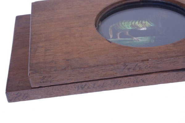 High quality hand painted images. Rarely seen made by Newton Opticians and GlobeMakers To the queen London slides. Both are in very good condition. With some signs of prior use on the wood board. Size is 67mm diameter glass, 164X99X10mm board. Board show some scratches, smudges and slight discoloring of the wood.