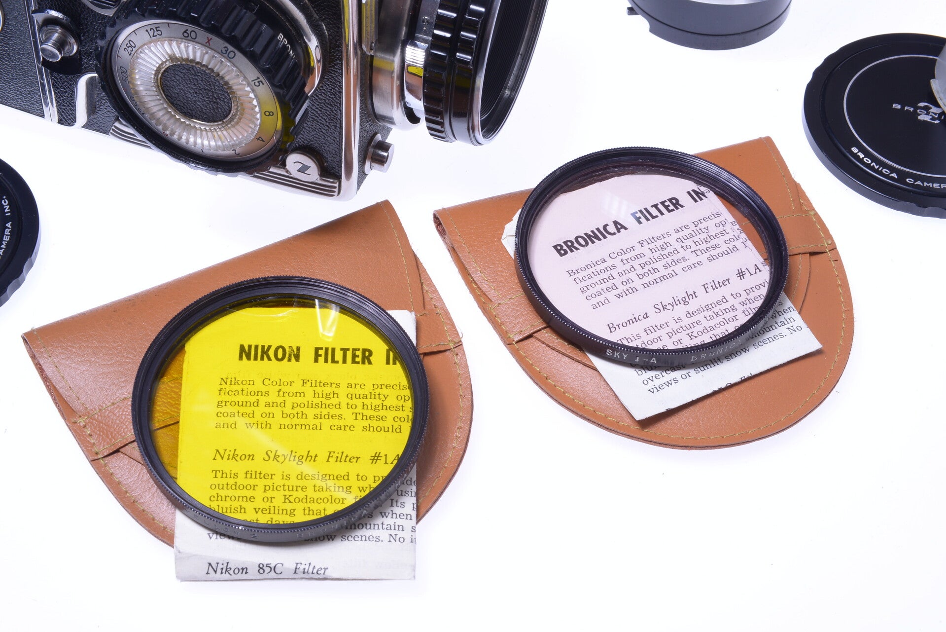 Camera comes with original leather case in very good condition, lens caps, Bronica and Nikkor filters, one hood, a flash support, 2x 120 roll film 6x6cm backs and a shoulder strap. All comes in the original covered wood case. No keys to the case.