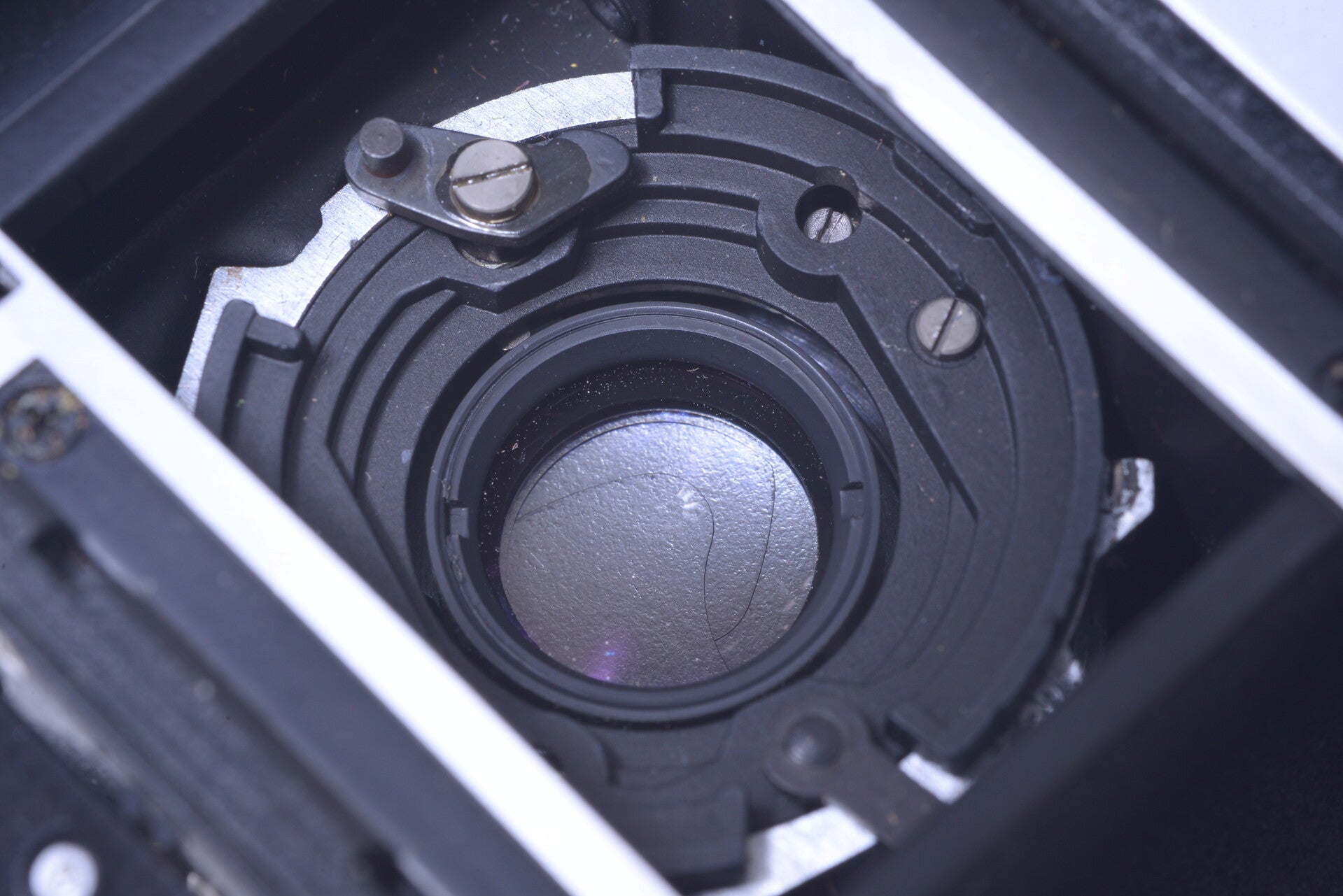 The camera shows minor signs of prior use and is overall in very good, minty condition. Shows no scuffs, no scratches, no dings, no dents, shows minor discoloring here and there. No wear at the cover. Finder in pretty clean and bright in very good condition, shows a very slight cloudiness. Shows no dust. Film winds on smooth.