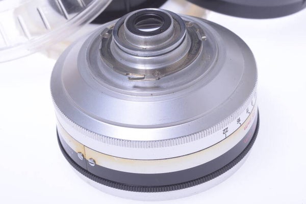Lens shows no signs of prior use and is overall in very good, minty condition. Shows no scuffs, no scratches at the bayonet mount, no dings, no indentations, shows no paint rub off. Aperture moves smooth. The elements are in very good condition. Show no cleaning marks, no scratches, no haze, no fungus, no separation. Shows no dust particles inside. W/ keeper and hood.