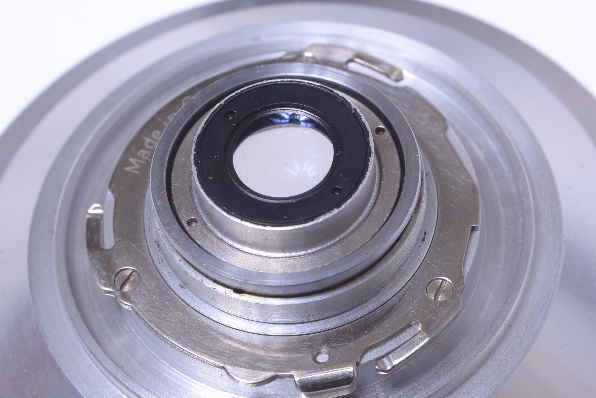 Lens shows some signs of prior use and is overall in very good condition. Shows some scuffs on the hood ring, no scratches at the bayonet mount, no dings, no indentations, shows no paint rub off. The elements are in very good condition. Show no cleaning marks, no scratches, no haze, no fungus, no separation. Shows no dust particles inside. W/ keeper and hood.