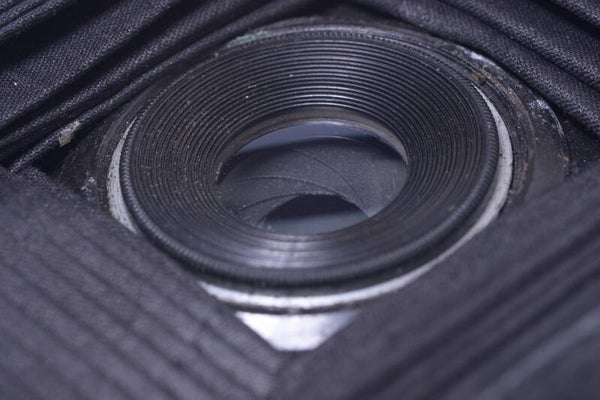 Bellows is original and in good, light leak free condition. Hood finder and ground glass original and in good condition, 'hinge' partially loose from the frame. Can be used.