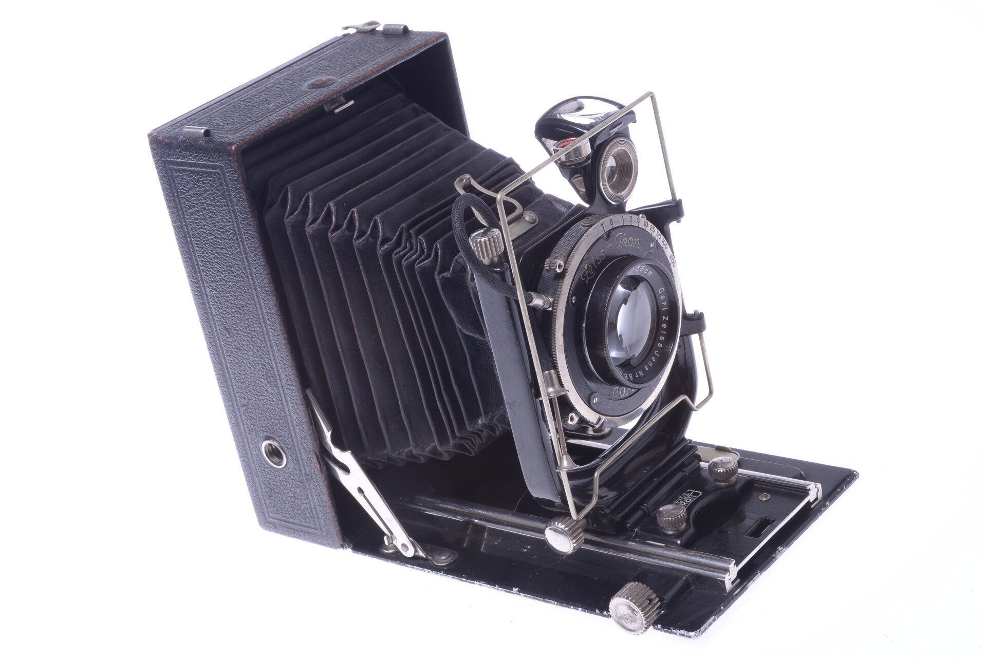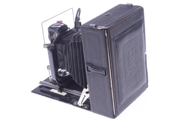 The camera shows minor signs of prior use and is overall in very good condition. Shows minor scuffs, minor scratches, no dings, no dents. Some wear at the tripod bush connector. Some paint rub off. Minor wear at the cover. Finder in pretty clean, bright and in very good condition. All movements operate smoothly. Bellows is light leak free. Ground glass viewer opens nicely and ground glass is in very good condition. The viewing hood opens perfectly. Spirit level works.