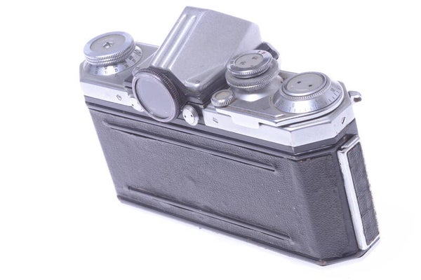Shutter and blind stuck half way. Mirror in good condition. Prism shows a glass chip off at the eye cup side and on the prism at the corner. See picture. Prism can be used.