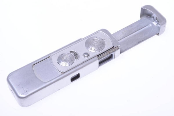 Camera faster shutters speeds accurate 1/2 sec. sluggish, other longer speeds are accurate, T & B setting works. Finder shows very slight haze. Filters retract. Rare upgraded model. Flash sync. was added by the Minox works.