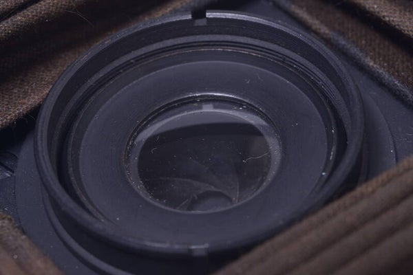 The lens element is in very good condition. No cleaning marks, no scratches, no haze, no fungus, no separation. Shows no dust particles inside. Aperture blades show some wear and are clean. Aperture open and close perfectly and smooth. Bellows and lens unit move smooth on the rail. Bellows are light leak free. Film winds on smooth. Comes with 618 take up spool.