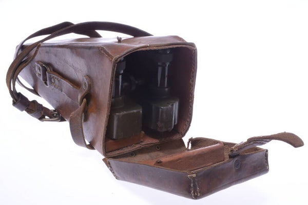 Binoculars shows moderate signs of prior use and are in pretty good condition. Beautiful patina. It shows some scuffs, some small scratches, some dings, some paint rub off. Comes with original leather case, shows wear. Strap also original and rigid.