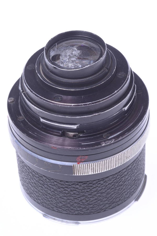 Rear element is damaged severely. Front element shows some small scratches. Aperture works. However, the aperture ring moves stiff. The aperture coupling works smooth. Front and rear bayonets show wear, but function well. Cover of the barrel is complete and in good condition.