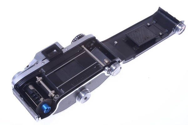 Shutter blinds are light leak free. Mirror is in good condition. Counter works. All fast shutter speeds accurate, longer speeds also accurate! B and T settings work. Prism finder shows some dust and ground glass few tiny scratches. Very nice working, ready to use, set. Comes with original take-up spool.