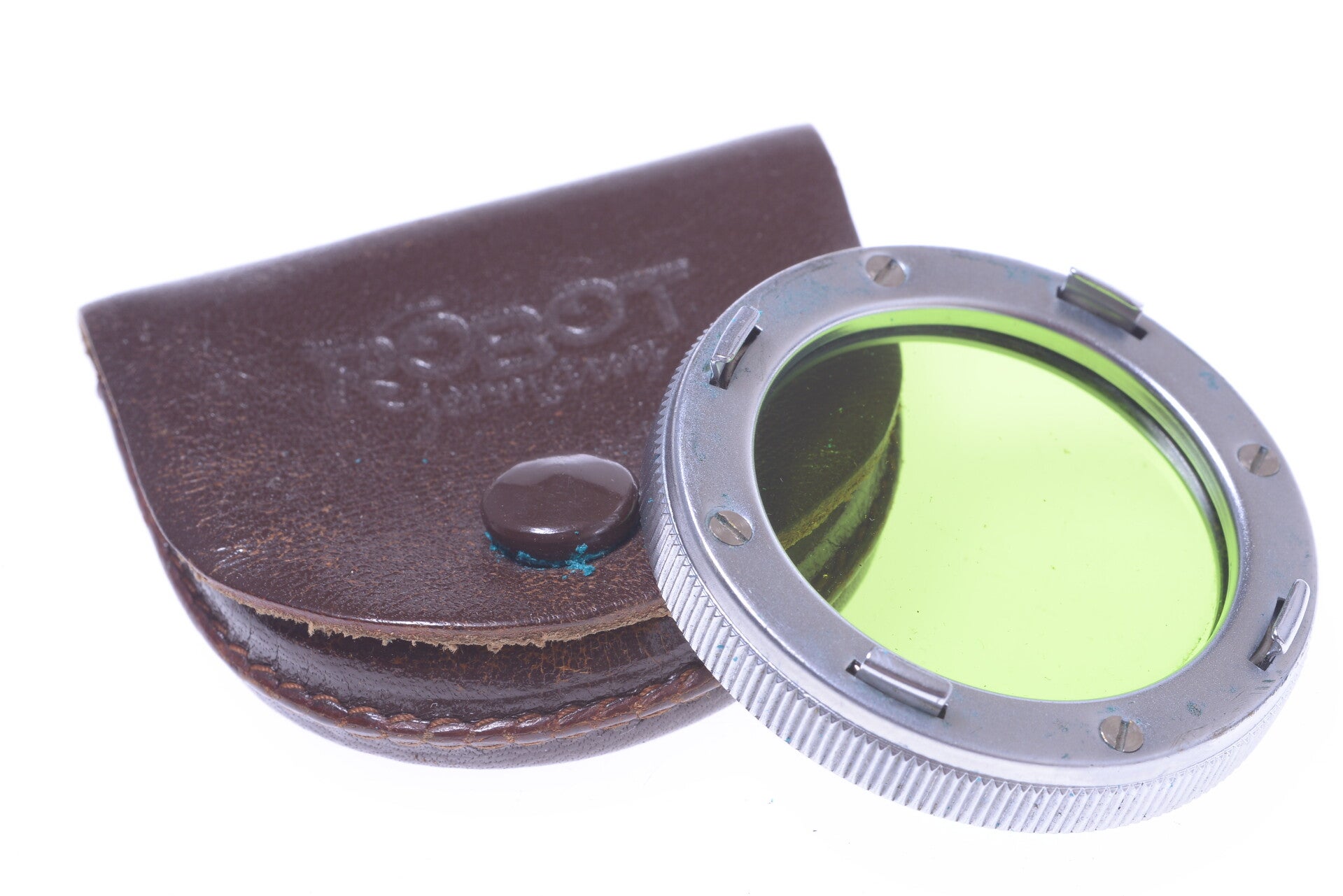 Filter in very good condition. With some signs of prior use. No dents, no dings. Fully functional. Glass shows no wear, cleaning marks or scratches. With Robot leather keeper.