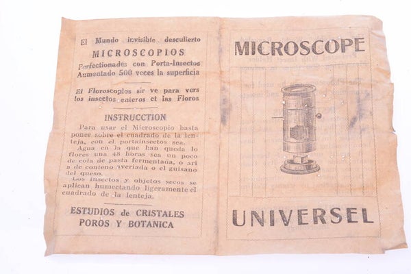 Microscope is in overall very good condition. With minor signs of prior use. Only shows some scuffs. Lenses in very good, clean and bright condition. No haze, no dust, no scratches and no cleaning marks. Scarce this complete with instructions(English, Spanish, French) and original pin and part of the original box(one side torn).