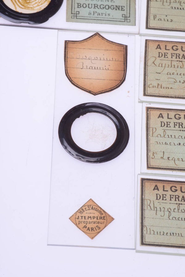 50 slides of Diatoms, Algae, etc... Some are dated by month and years 1877 & 1884 and other dates. Thee are 12 Temper & Petit, 14 Temper & Dupray, 1 Temper, 1 Eugene Bourgogne Silver Medal Algae specimen, 4 seem blank and 18 other without maker brands. Size of the specimen slides is 27x76mm. Nice hand written data of the makers.