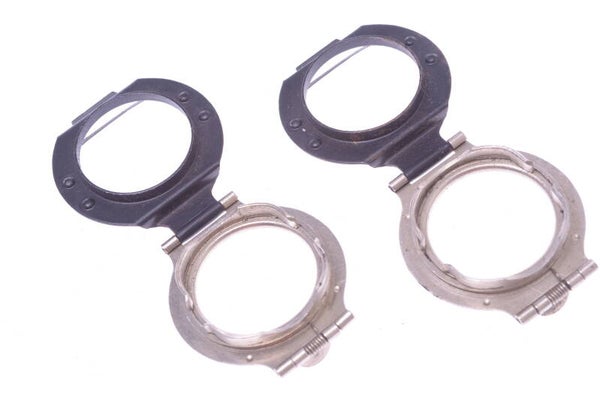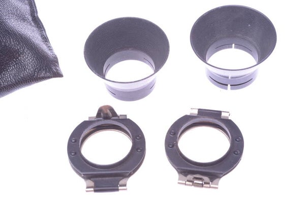 Antique hoods in very good condition. With minor signs of prior use. Fully functional. Metal shows minor wear, minor paint rub off. The adapters hinge open to accept drop in filters. Fits 27mm outer diameter lenses.
