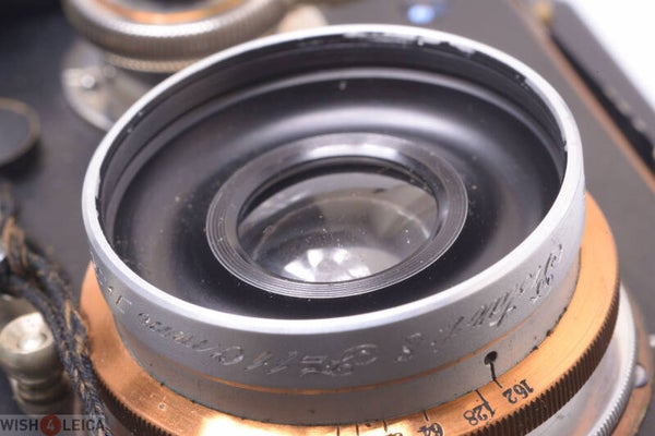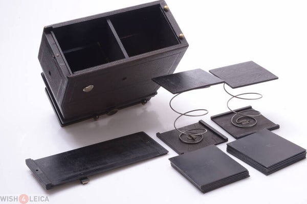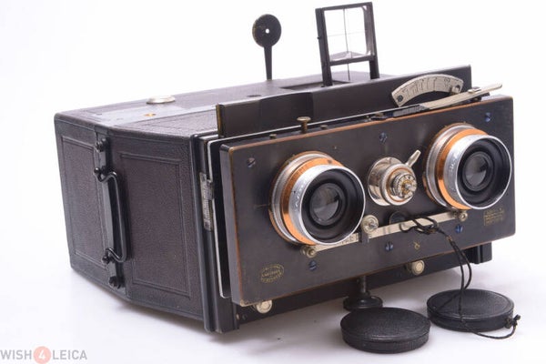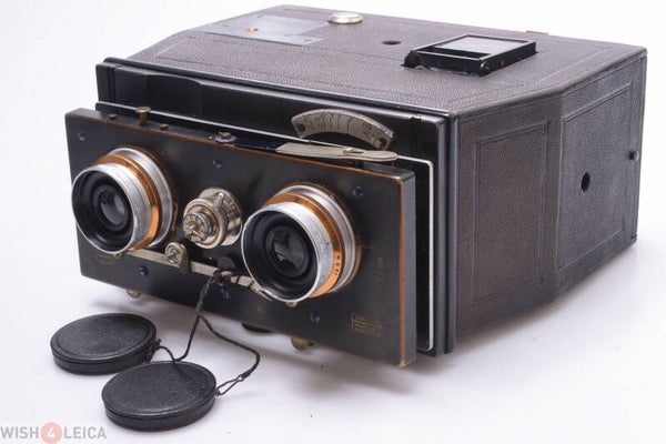 Camera is overall in very good condition, with some signs of prior use. Shows some scuff marks and scratches on the camera here and there. Adjusting aperture is smooth. Aperture in good condition, with some wear on the blades. The lenses, 110mm f/8 Zeiss Protar, elements are in very good condition. Show no cleaning marks, no scratches, no fungus, no separation, no haze on or in between the elements. Finder in very nice and clean condition. Camera comes with plate holders as shown and lens caps, all in the original casing. In all a beautiful rare stereo camera.