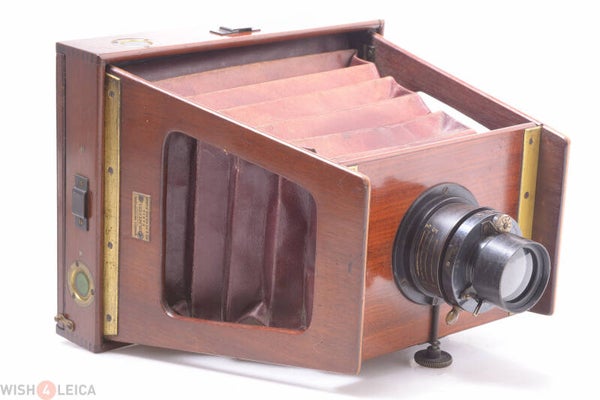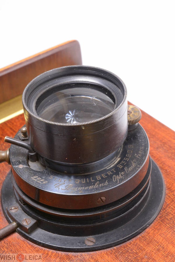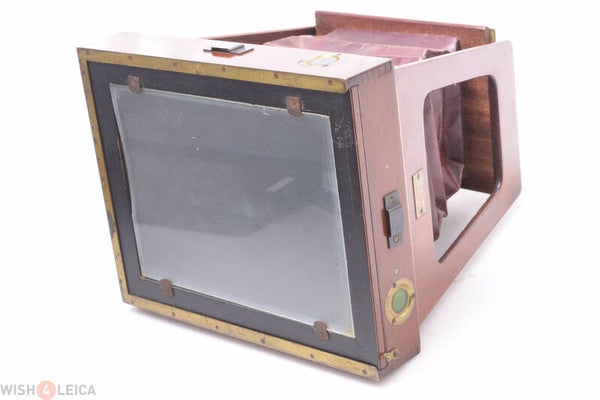 Rare Guilbert shutter and lens. With nice rack and pinion focus wheel. Original red leather bellows is light leak free. Shutter works, very sensitive. Small piece at one side missing of the ground glass. Otherwise in good condition.