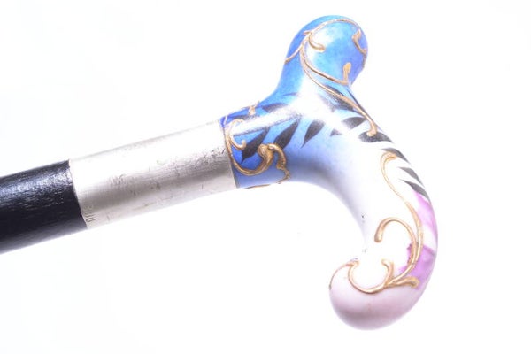 ANTIQUE CANE WALKING STICK PORCELAIN HANDLE FLORAL & GOLD DESIGN 77.5CM 30.51”