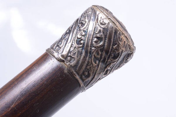 ANTIQUE CANE WALKING STICK SILVER POMMEL FLORAL DESIGN 86.5CM, 34.05”