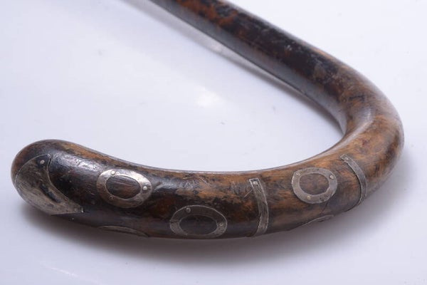Handle shows few dings, no dents and some discoloring. Metal inlay might be silver.