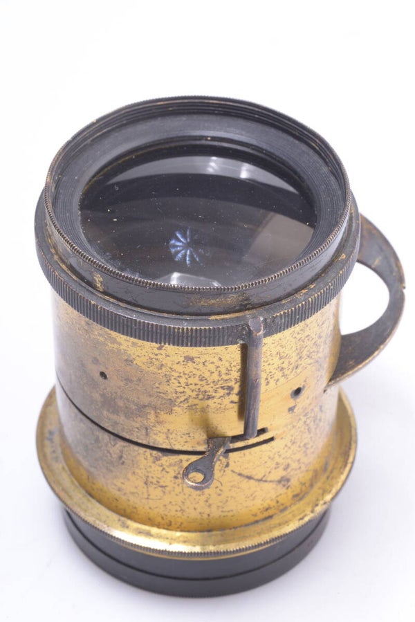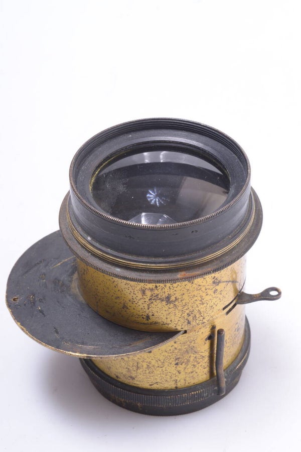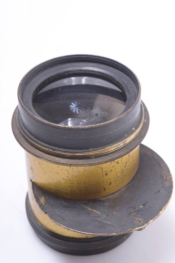 BRASS ANTIQUE LENS FIELD OR STUDIO CAMERA APPROX. 250MM COVERS 4X5, 5X7