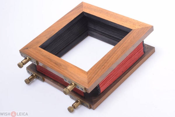 Hood is in overall very good, minty condition. Shows minor scratches, scuffs, no cracks, is clean. Distance between the centre of the holes of the brass rod attachment is exactly 11.5cm. Max. pulled out is 30cm. Minimum is 4.9cm when all the way collapsed. Bellows in light leak free and in very good condition. Beautifully constructed. Inner size is 12x12cm, outer size of the wood is 17.2x17.2cm.