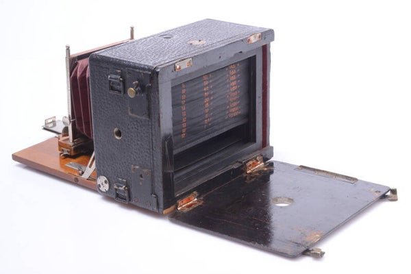 Focal plane shutter doesn’t work, ribbons came loose and the second blind doesn’t roll into place. Blinds are wrinkled. Blinds show pin holes. Bellows is light leak free. The hinges of the back plate are missing screws and back plate has a small crack at the screw holes.