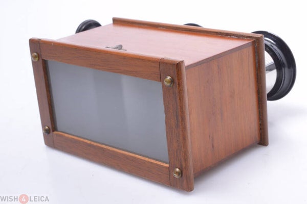 Viewer is overall in very nice condition, with some signs of prior use, and works perfectly. Shows small repair at the rear. Shows no cracks on the lens unit board. The cups are in good condition show no cracks. The lenses are in good condition, no cracks and clean, shows no glass chip off. Shows minor scuff marks, few dings and minor small scratches on the wood, but really not that much. The original lacquer is shiny and bright. Nice 45-107mm viewer. Focus operates smoothly. Elements and ground glass are original and clean.