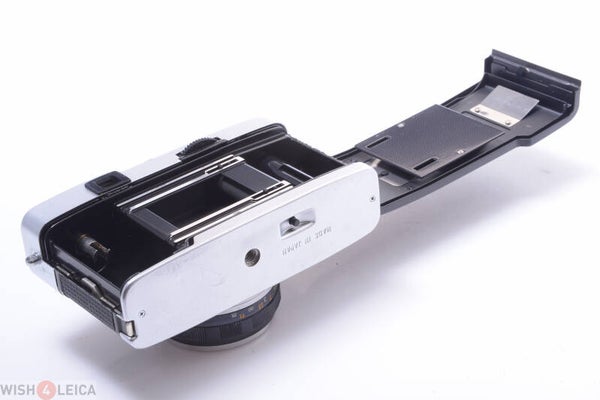 Camera shows minor signs of prior use and is cosmetically overall in very good condition. Shows some scuffs marks, small scratches, no dings, small indentations at the bottom, some wear, shows no paint rub off at the metal corners. Shows no wear at the cover. Finder in bright and clean condition. Aperture and motive rings move smooth.