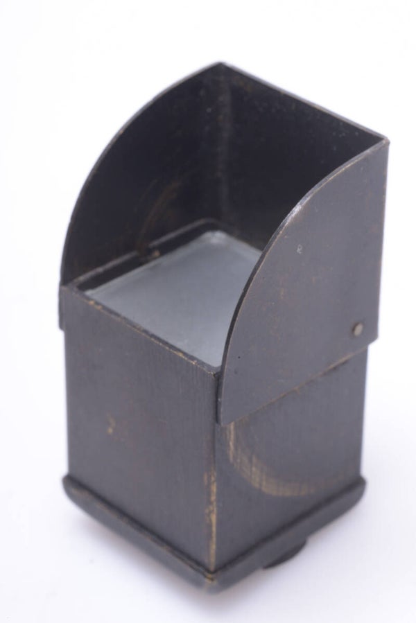 The finder is in good condition. It shows some signs of prior use. It shows some scuff marks, a few tiny dings and some scratches here and there. The element is in good condition. The mirror shows some de-silvering. The top opens and closes smooth. Size is 26x26x30mm. The foot is 4mm at one end and 6.5mm at the other, and just somewhat lower than 1mm in height.