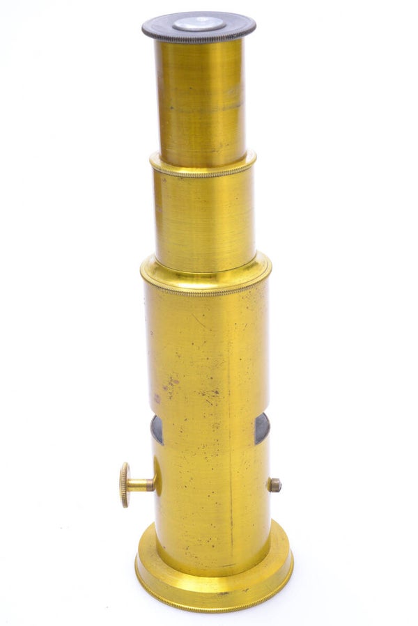 ANTIQUE BRASS DRUM MICROSCOPE 15.5CM, 6.1” FRENCH IN ORIGINAL WOODEN CASE