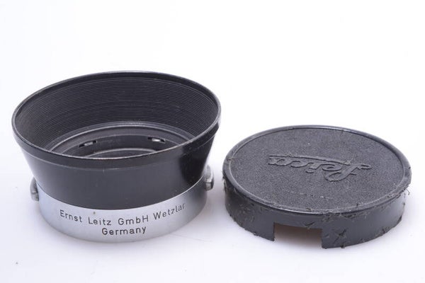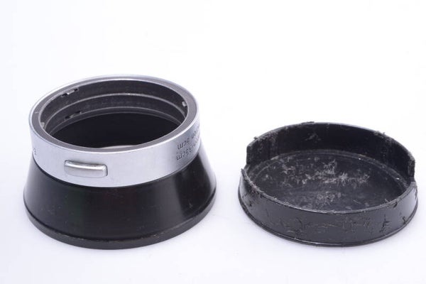Hood comes with cap, shows some wear, that can be put on when the hood is reversed on the lens. Hood cannot be reversed on Summaron or collapsed 50mm lenses.