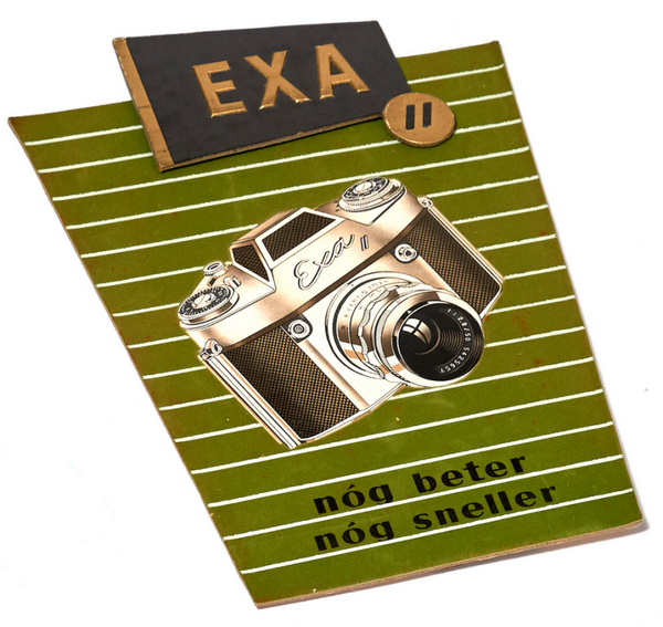 Original cardboard Exa II store display is in overall very good condition. Shows some swear. Clean and bright picture and graphics. Bit 3d. Camera is embossed. Reads ’Nog beter, Nog sneller’ meaning Even better, Even faster.Size: 17x24cm, 6.69x9.45”