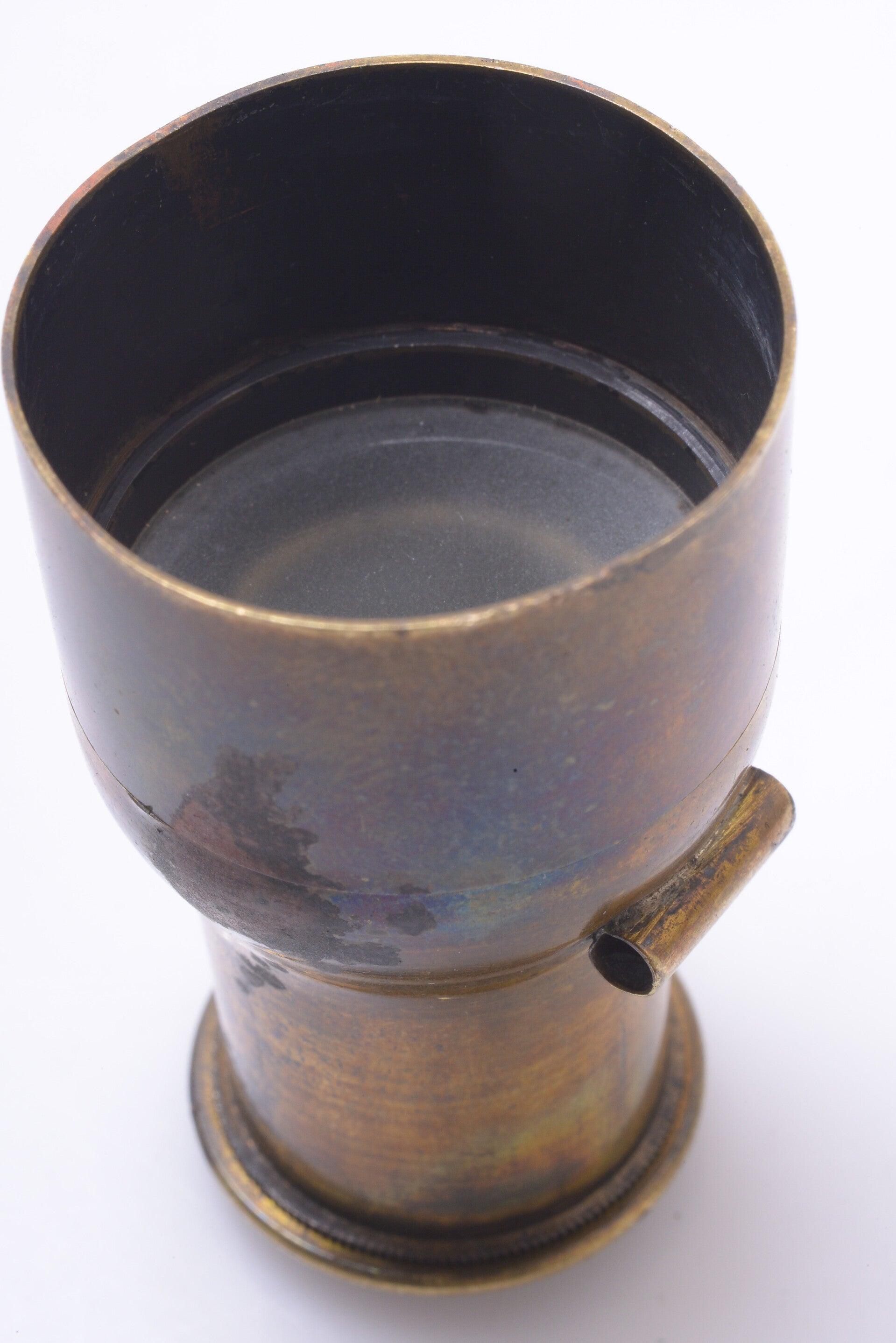 Shows no scratches at the glass element.Finder in nice condition. Shows some wear and discolouring on the sides. Glass in very good condition, is clean and bright.Shows some dings, no dents. Top part turns smoothly.