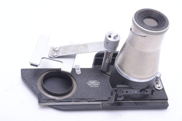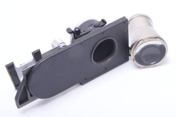 Original Leica 'OOZAB' focusing stage with 'LVFOO' finder. Shows some signs of prior use. Some scuff marks and scratches. Some paint missing on the black painted parts. Works perfect. Slide operates fairly smooth. Screen in very good condition. Finder is quite clean and very bright.