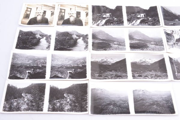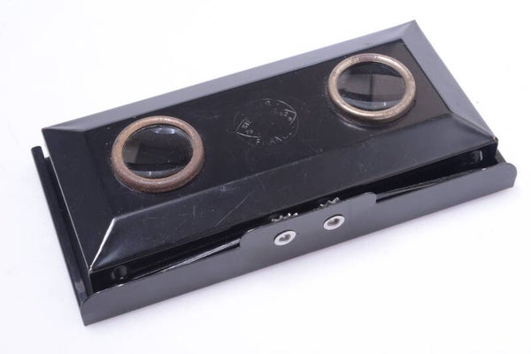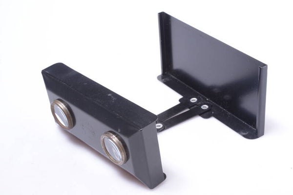 Nice scarce folding focussing model. Made in France. Viewer is for card images. Eye cups shows some superficial corrosion. With 11 stereo pictures of Alps, a man, rivers, castles and Lourdes.