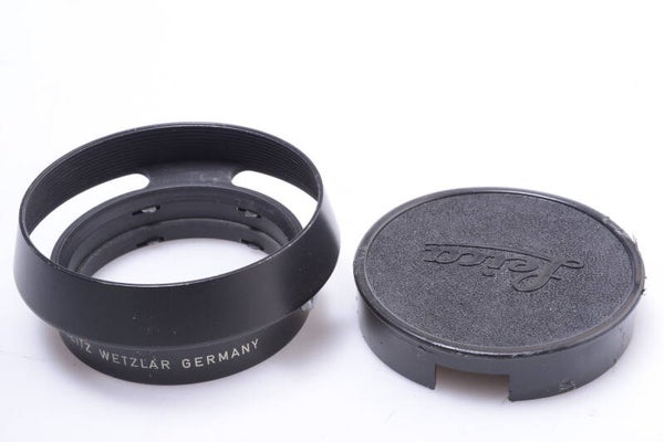 Hood comes with cap, shows some wear, that can be put on when the hood is reversed on the lens. Hood cannot be reversed on Summaron or collapsed 50mm lenses.